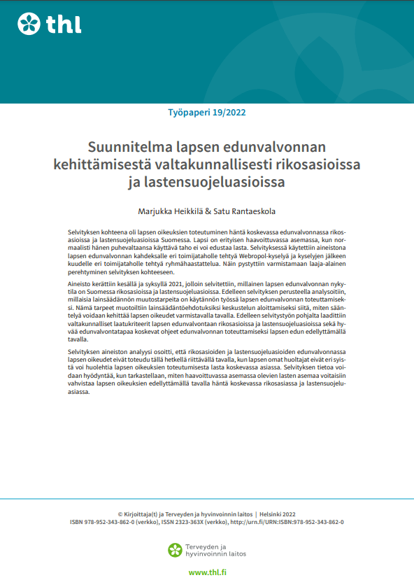 Suunnitelma lapsen edunvalvonnan kehittämisestä valtakunnallisesti rikosasioissa ja lastensuojeluasioissa -selvitykseen pääset tästä.